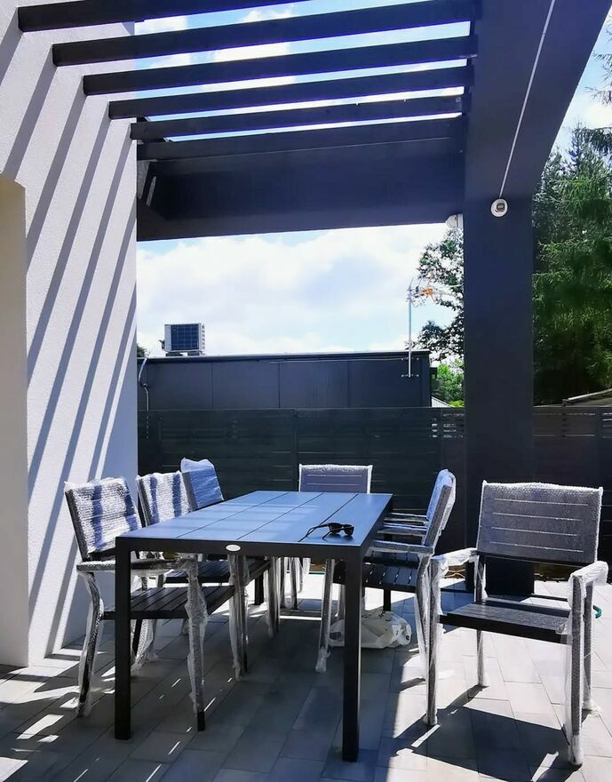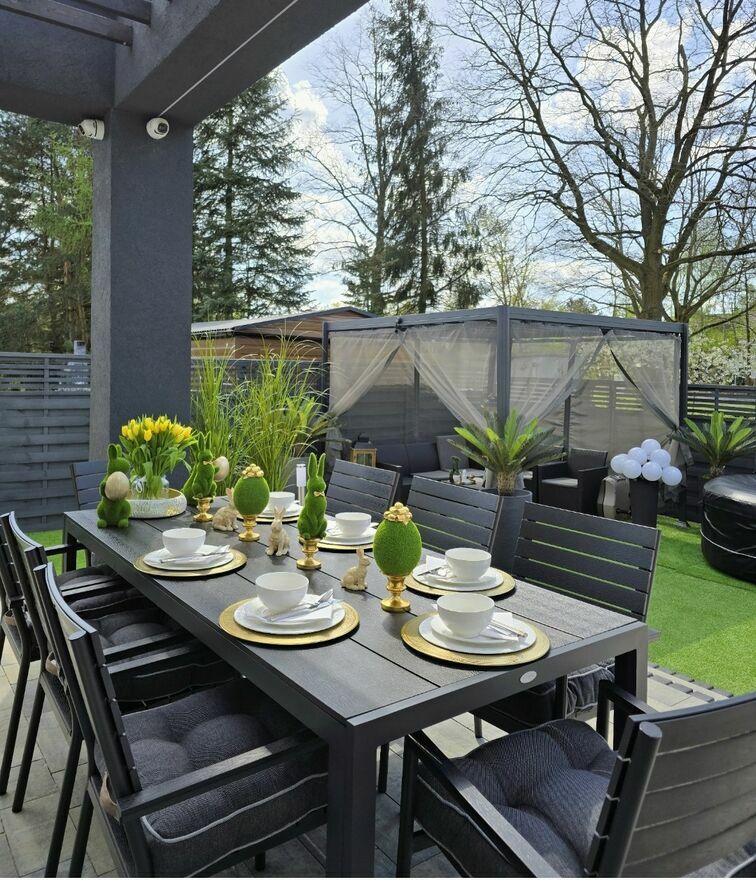 Sprzedam piekny jak nowy komplet mebli tarasowych w skladzie(Duży stół +8 krzeseł)Kolor ciemny grafit /szary +8 szt grubych poduszek na krzesła gratis- są na 1 zdjęciu widoczne